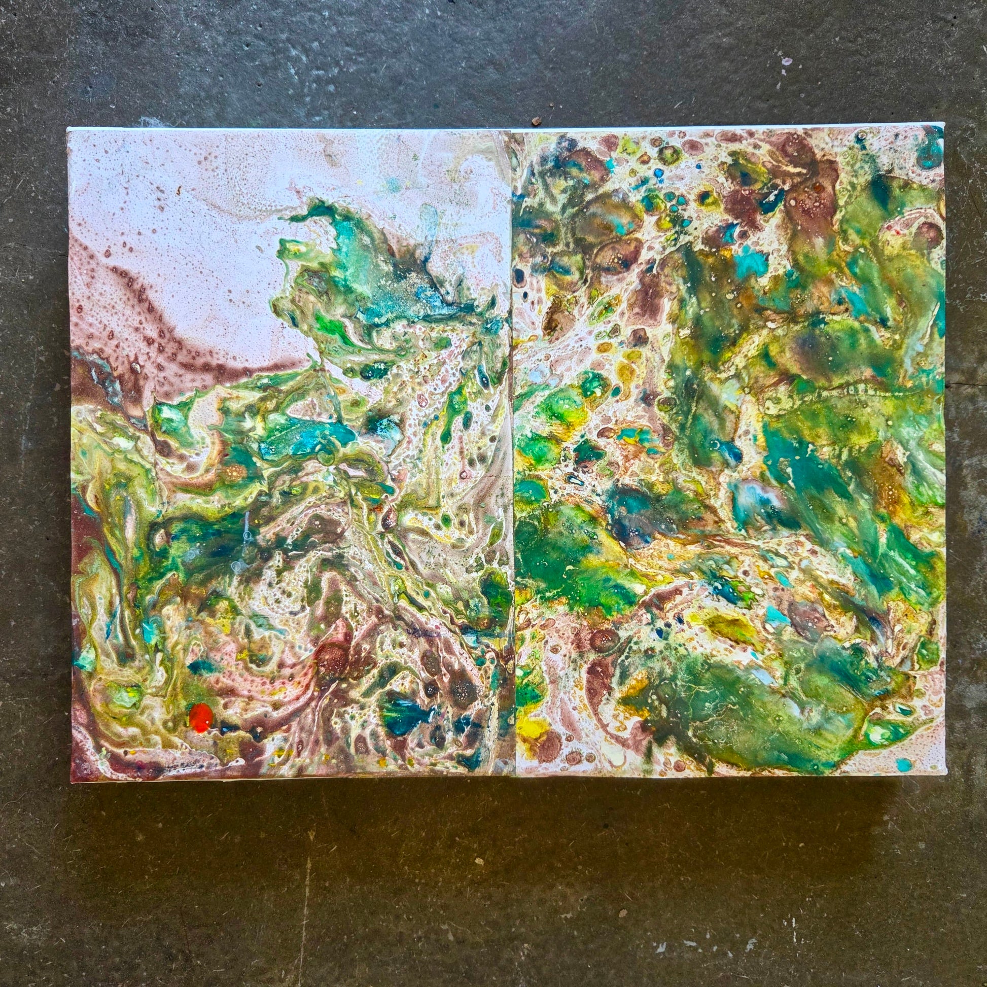 2 feuilles de papiers marbrées à l'huile originales, marouflées sur toile. Illustration de deux personnalités formant un couple proposée par l'artiste Hortense Garand Vernaison. Réalisée à Vallauris en 2025