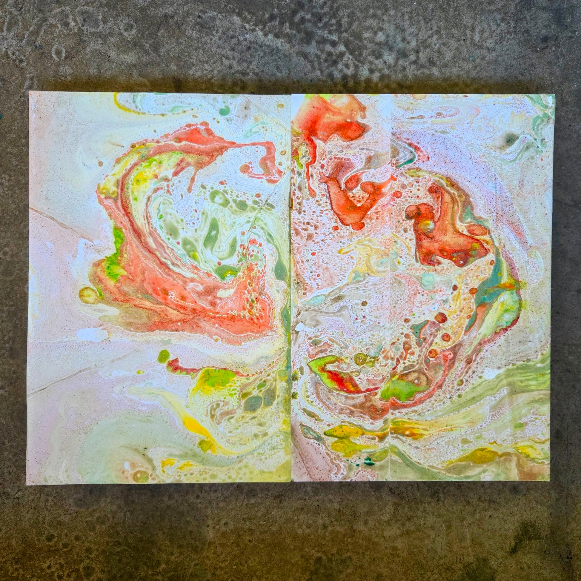 2 feuilles de papiers marbrées à l'huile originales, marouflées sur toile. Illustration de deux personnalités formant un couple proposée par l'artiste Hortense Garand Vernaison. Réalisée à Vallauris en 2025
