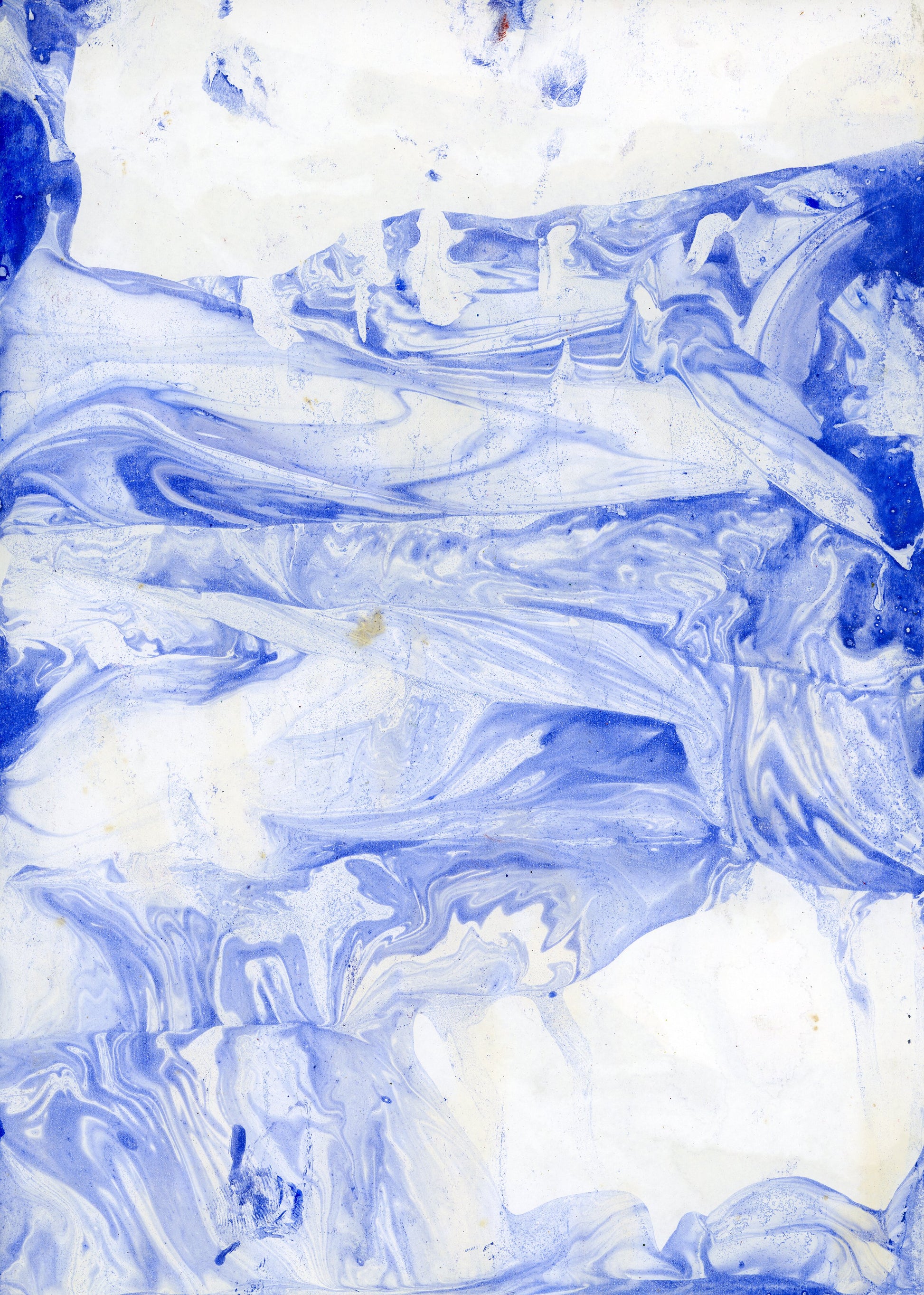 Impression dibond brillant 3mm d'une planche originale de papier marbré à l'huile dans les tons Outremer, évoquant un paysage de montage au travers des reflets de l'eau - format 30x40 cm.
